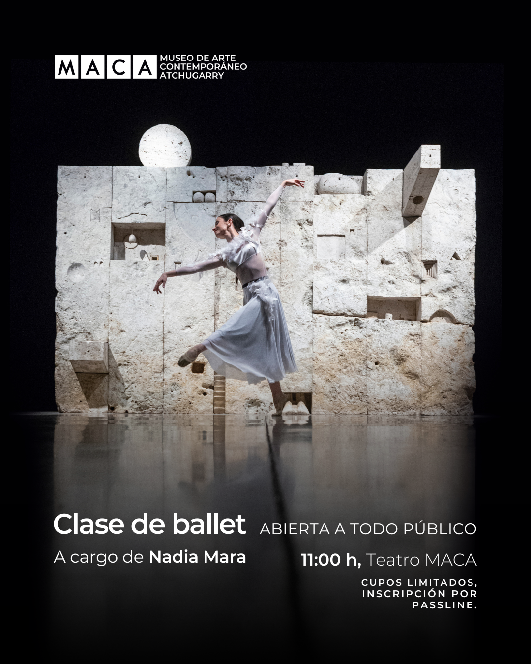 Nadia Mara dictará una clase de ballet abierta a todo público en el Teatro MACA para dar inicio a la jornada del Día Internacional de la Danza. La actividad está destinada a personas de todos los niveles. Las inscripciones se realizan a través de Passline y los cupos son limitados.