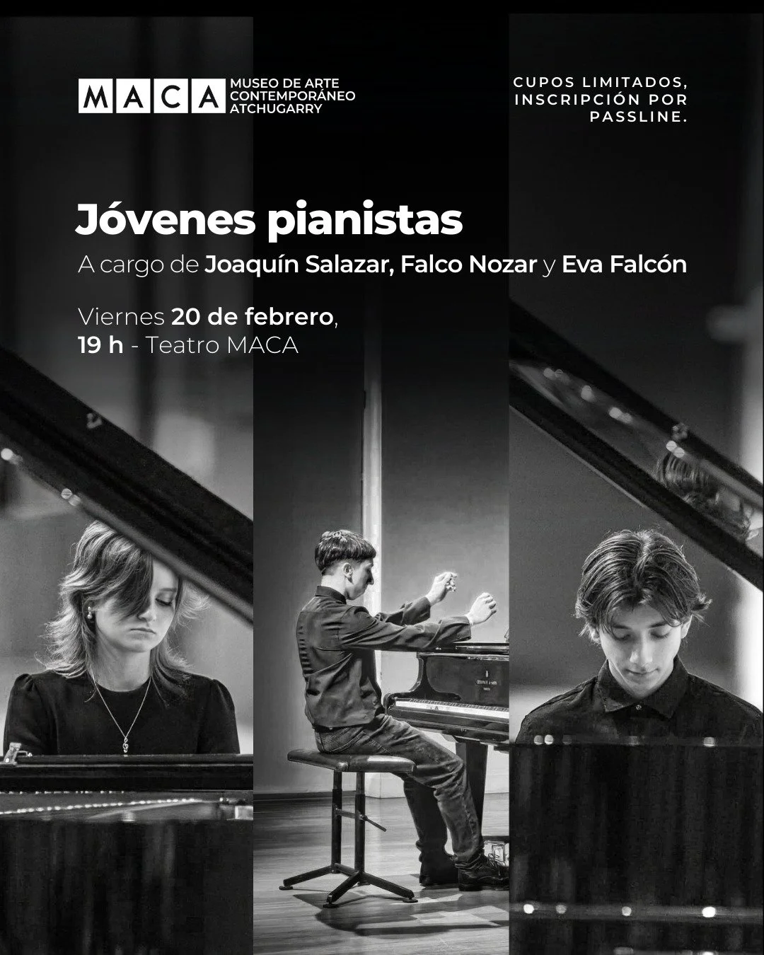 El MACA presenta un concierto dedicado a jóvenes pianistas uruguayos e internacionales en formación, con un programa que recorre repertorios del Barroco al siglo XX. Participan Joaquín Salazar, Falco Nozar y Eva Falcón, en el siguiente orden de presentación: