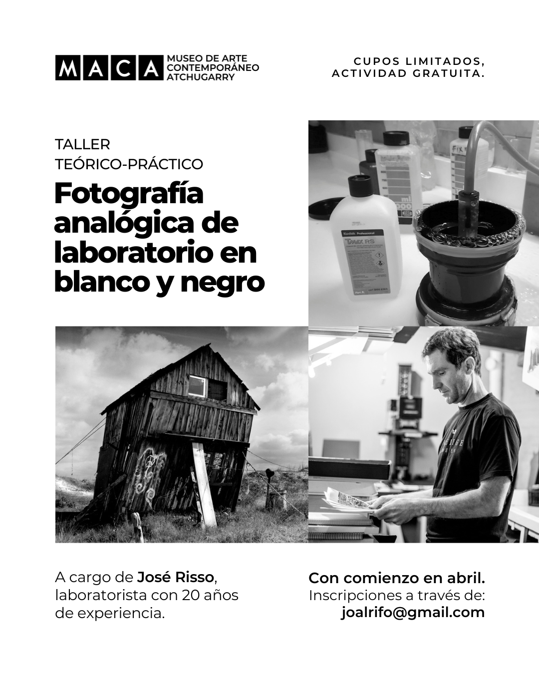 Este taller teórico-práctico introduce los fundamentos del trabajo en laboratorio analógico y permite realizar ampliaciones a partir de negativos de 35 mm y formato medio.