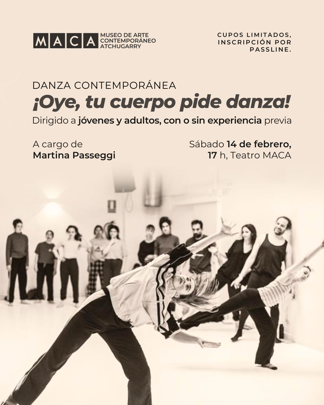 El MACA presenta un taller orientado a jóvenes y adultos —con o sin experiencia previa— que invita a reconectar con el cuerpo a través del movimiento, la música y la grupalidad. Basado en principios de la danza contemporánea, la propuesta busca celebrar el movimiento y el disfrute, generando un espacio para explorar y provocar la propia danza.